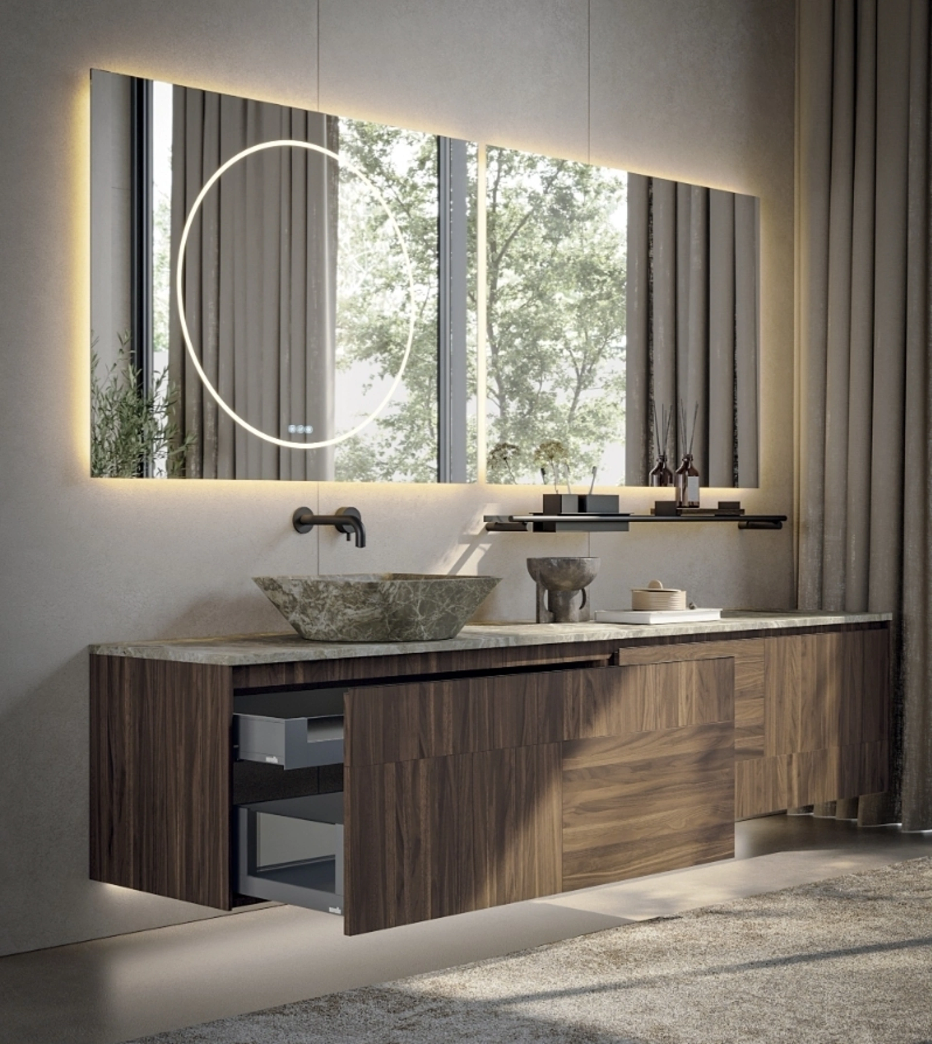 Arreda la stanza del benessere design al meglio con Elle 07, mobili bagno sospesi e accessori in legno di Novello.