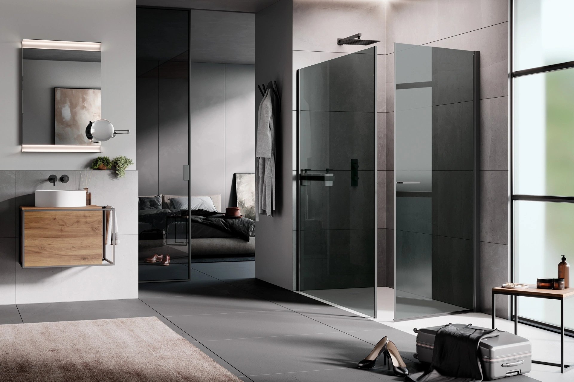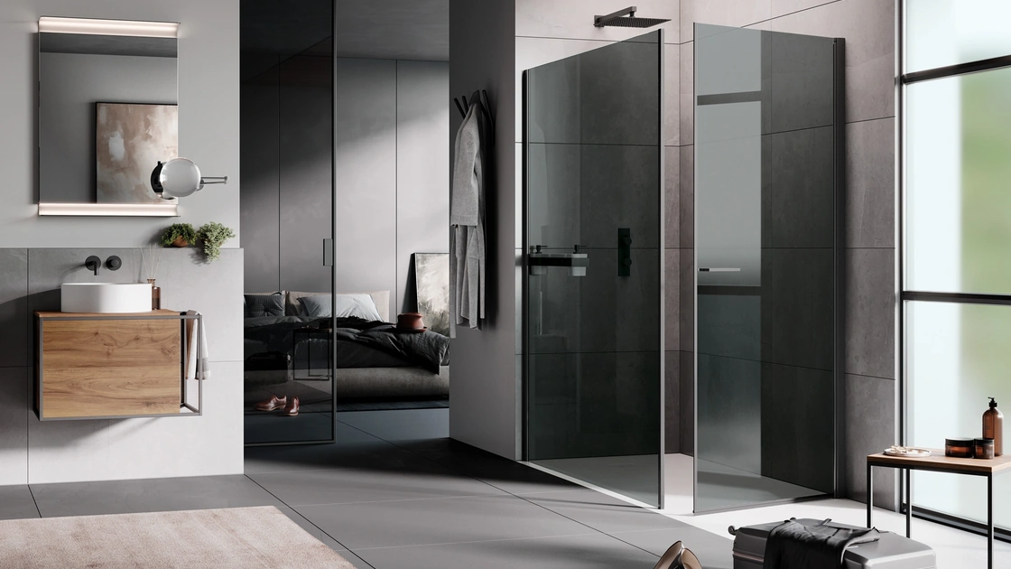 Arreda il tuo bagno moderno al meglio con Open Battente, box doccia e complementi in vetro di Samo.