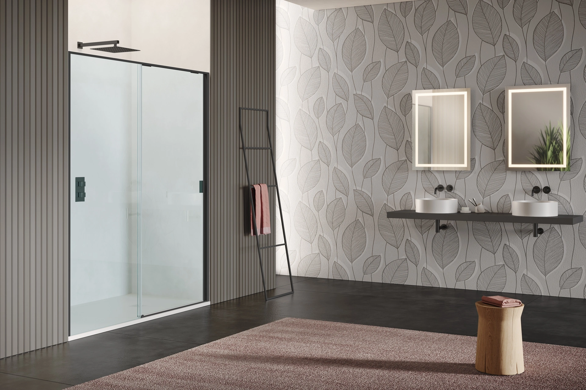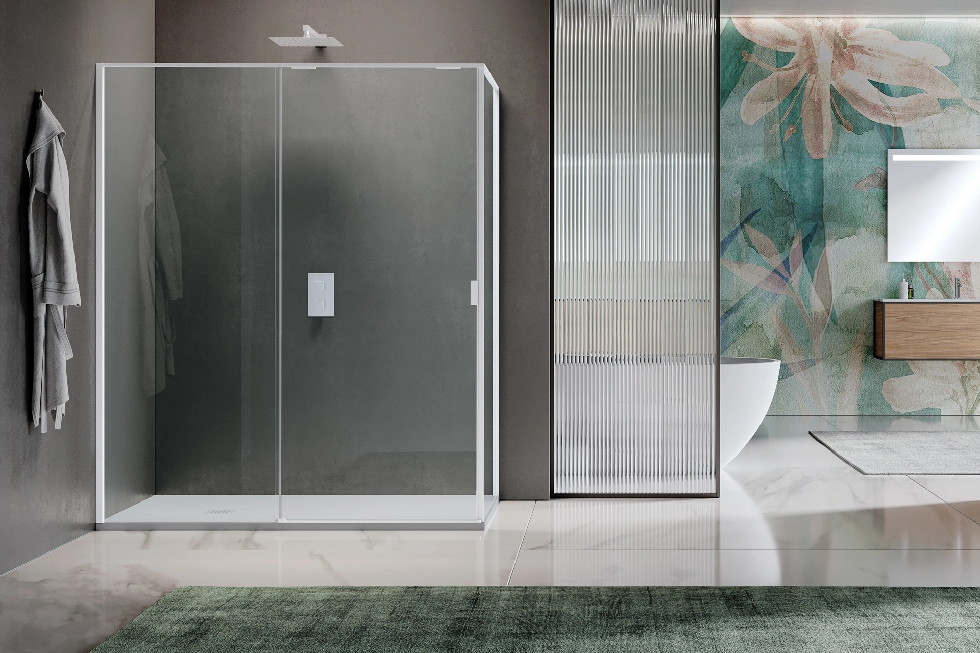 Arreda il bagno di casa moderno perfettamente con Pyxis Scorrevole, box doccia e complementi in vetro di Samo.
