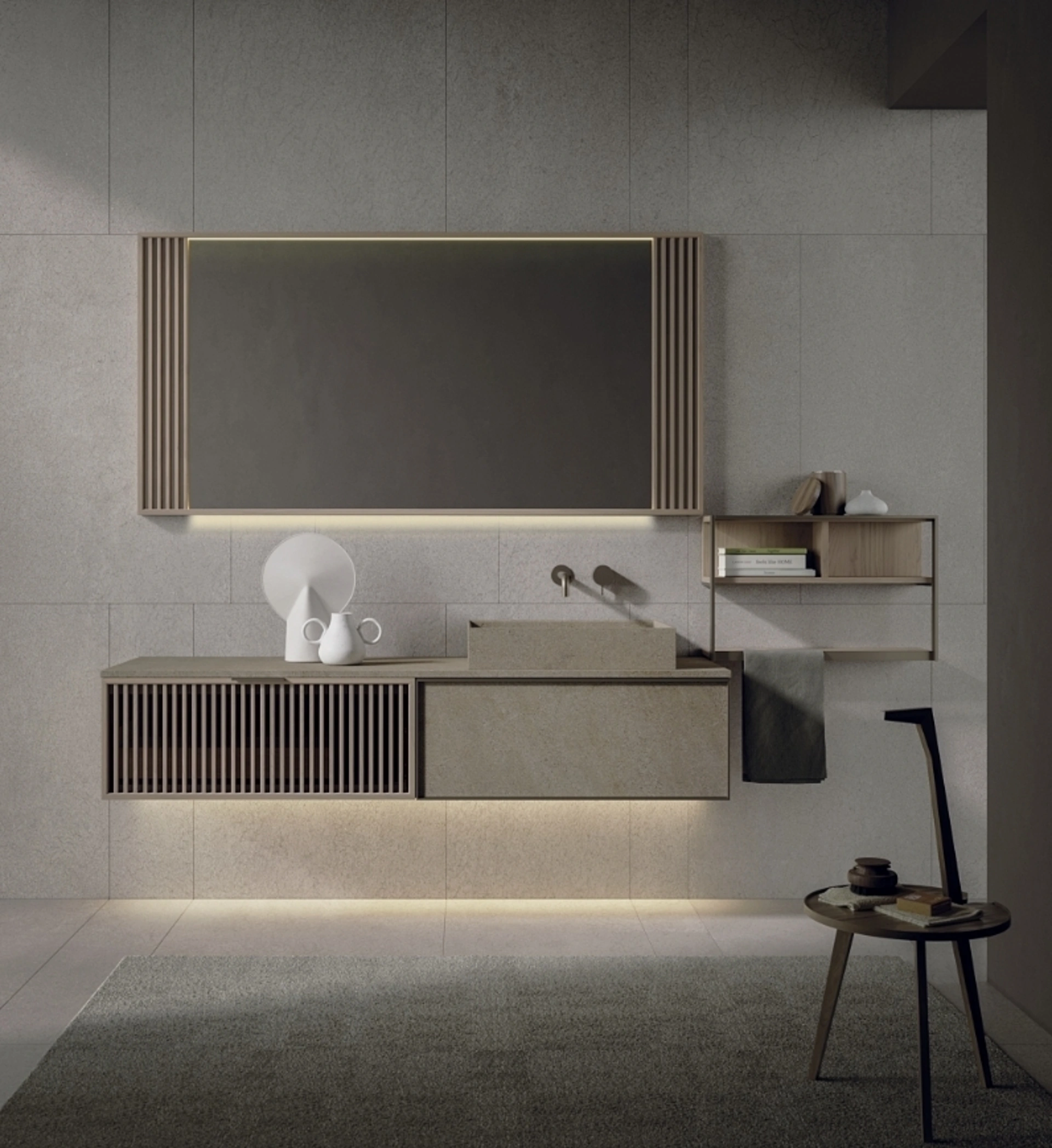 Scopri di più sull'arredo bagno design: mobili bagno sospesi in gres come il modello Quari New 02 di Novello ti attendono.