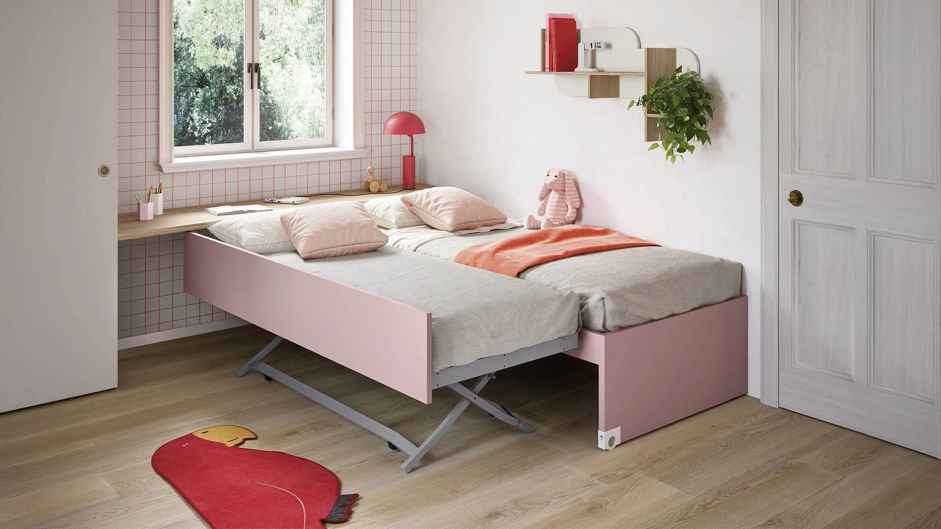 Arreda stanzette moderne con le Camerette salvaspazio Nidi! Il modello Salvaspazio Letti Estraibili in melaminico è per bambine.