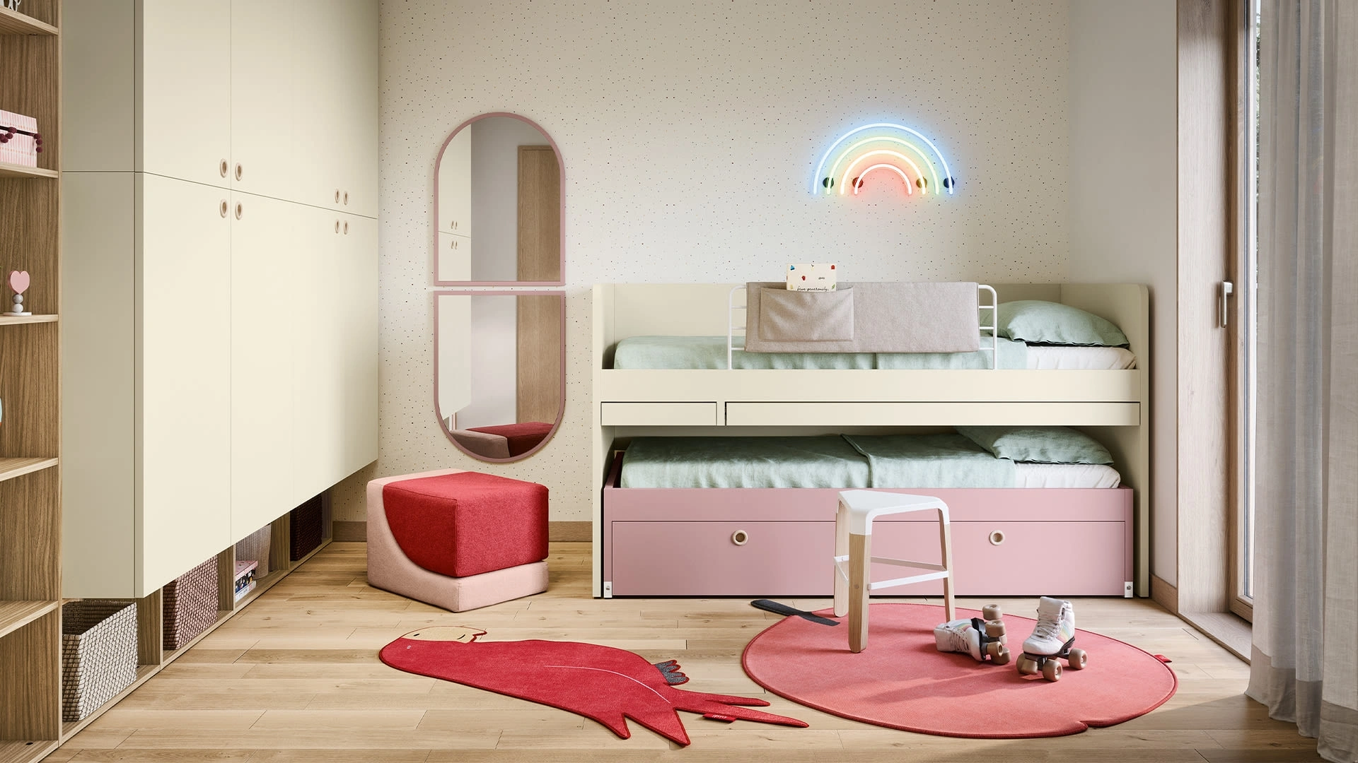 Arreda stanzette moderne con le Camerette salvaspazio Nidi! Il modello Salvaspazio Letti Rialzati in melaminico è per bambini.