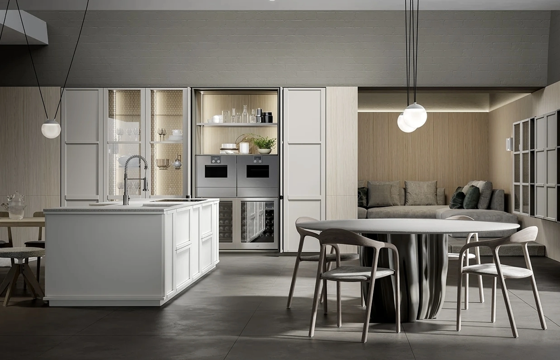 Clicca e scopri un mondo di Cucine Moderne con isola: la cucina E05 Eclettica Optima 01 Scandola in laccato opaco ti sta aspettando!